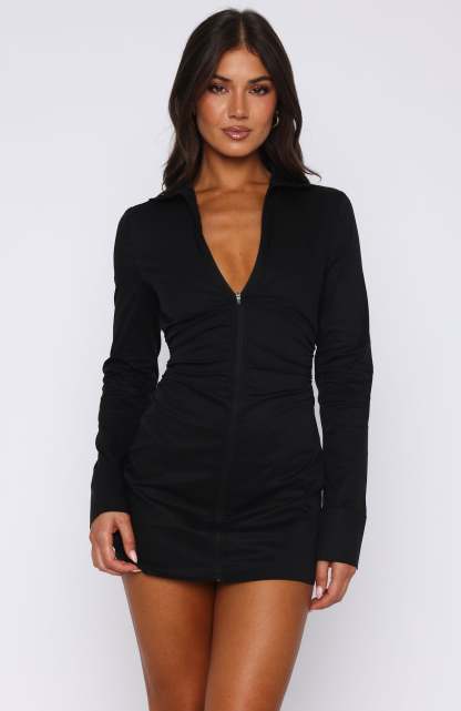Introducing our newest micro mini dress the Always Will Be Long Sleeve Mini Dress in Black! Features collar neckline, long sleeve with zipper closure on cuff, zipper closure centre front and ruched detailing on side. Complete the look with kitten heels or high knee boots for cooler nights!