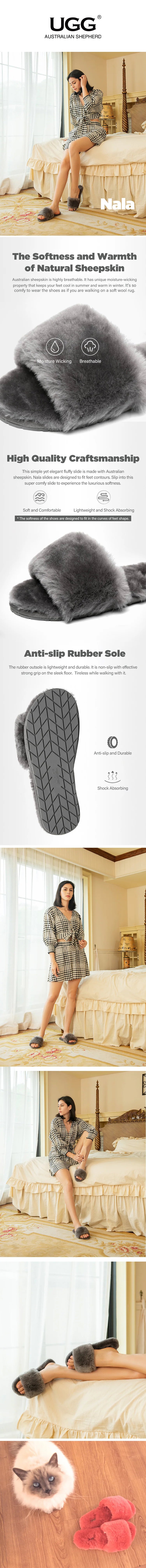 - These ugg slippers with Australian genuine sheepskin upper, lining & insole. Natural sheepskin wool has moisture-wicking properties while gently keeping your feet in ultra warmth and luxurious softness.
