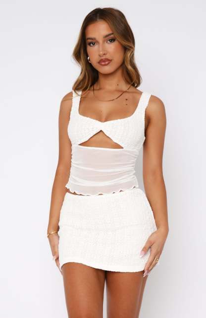 Bring some fun to your wardrobe with the Can't Hear You Top White! Features thick shoulder straps, lined at bust, sheer bodice, front cut out detailing, cropped length, side ruching detailing, and stretch material for an easy slip on design. We love this styled with the Can't Hear You Mini Skirt for the cutest matching moment!