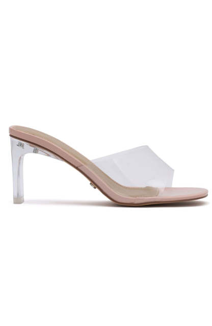 Celeste Mules Clear are a staple for every fit. These heels have a high perspex, thin block heel, open square toe design and soft, thick clear vinyl toe strap.