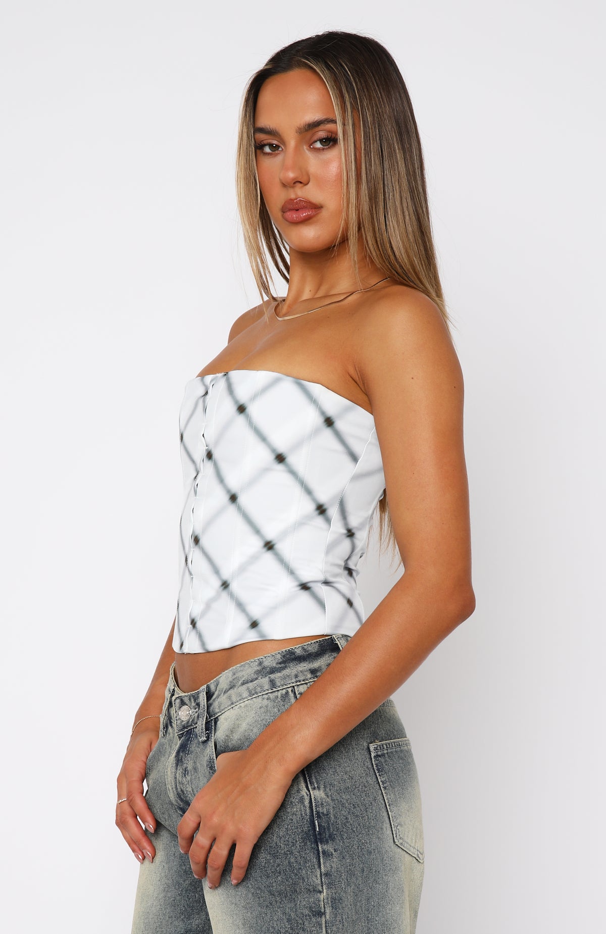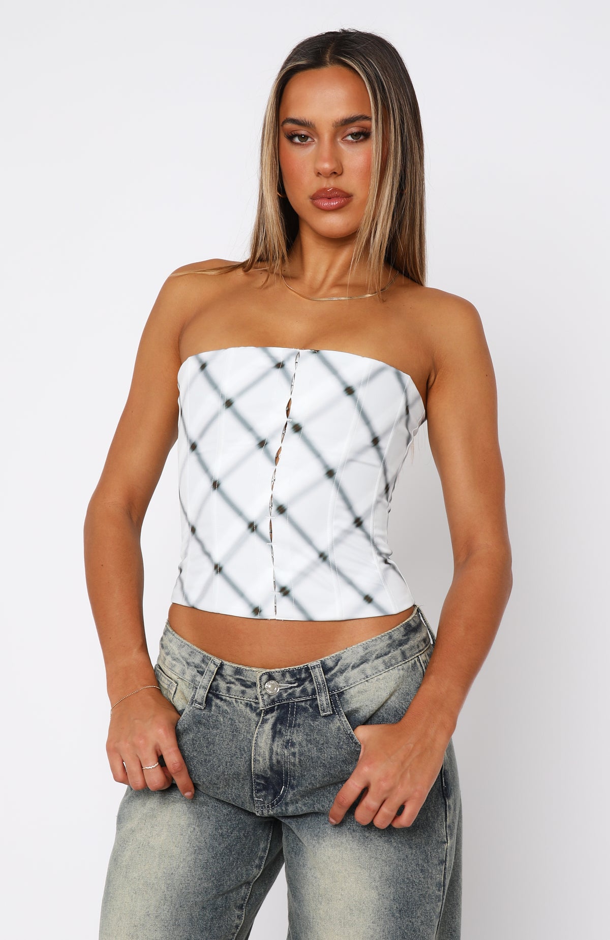 A fresh print for a fresh day. The Certified Lover Bustier Shadow Check will elevate your look! Features a strapless fit, grip tape, bonding in bodice, straight hemline, adjustable lace-up back design, lined fabric and gorgeous printed fabric. Pair with a low rise jean and let the bustier do all the talking.