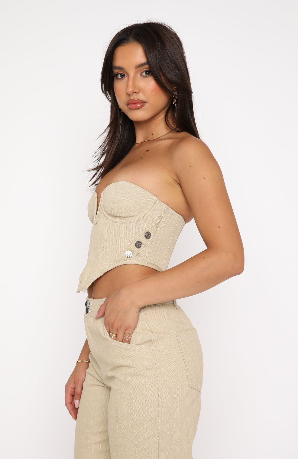 You’ll be influencing them all in our new Change My Mind Bustier in Oatmeal. Featuring bust underwire, boning in bodice, zipper centre back and button design. Complete the look with the matching Power Play Pants and heels for a look we are loving.