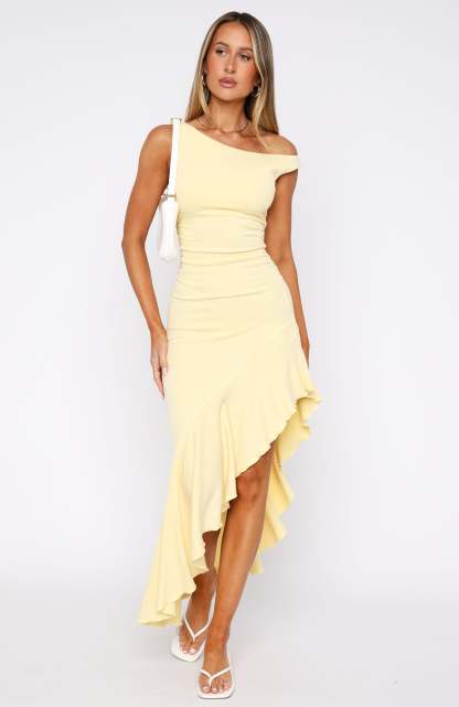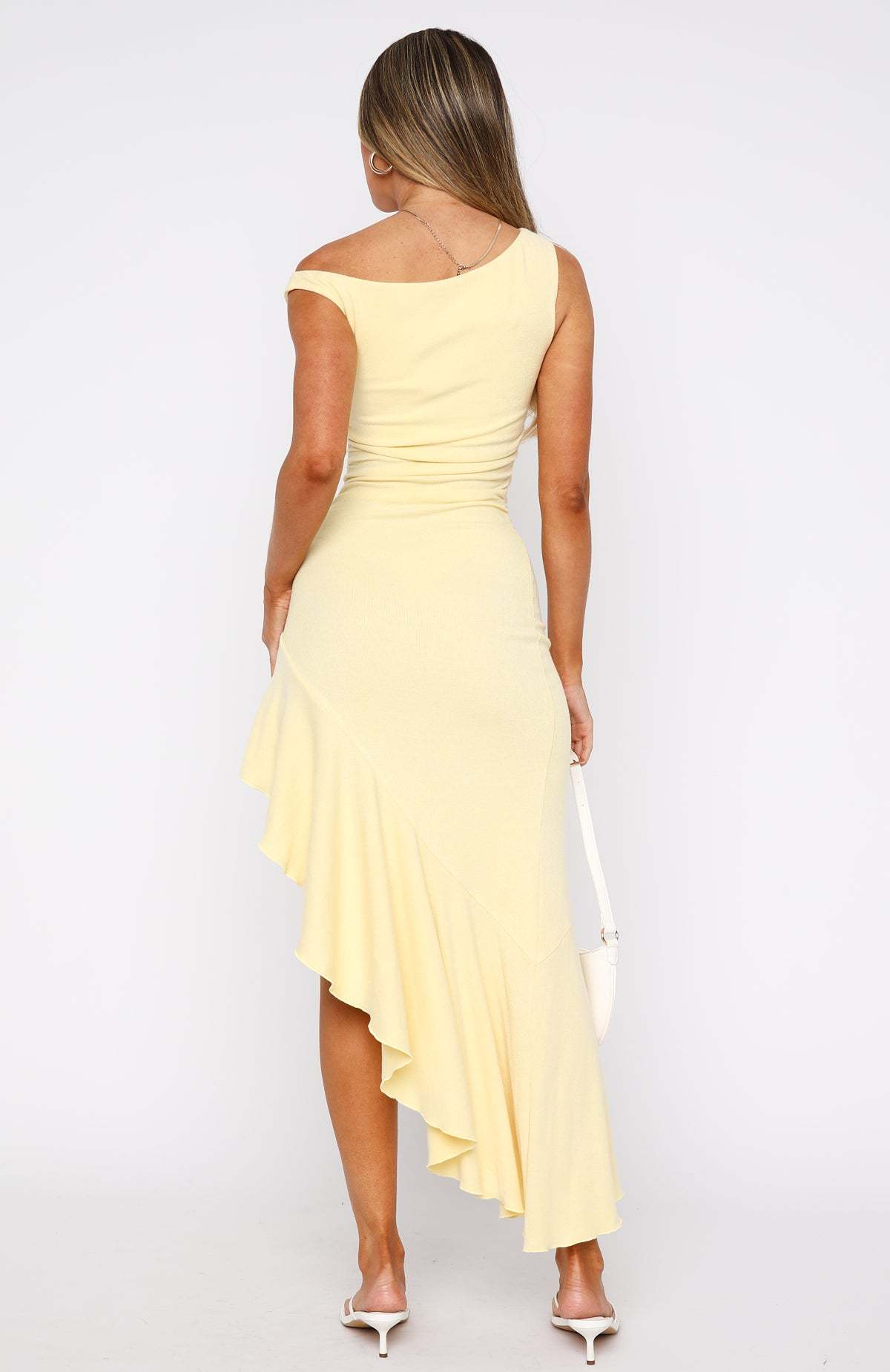 Weekend dress code: the Everybody Loves It Maxi Dress Lemon. Features a one shoulder design, maxi length with asymmetrical frill hem detailing and buttery, soft stretch material for an easy slip on design. Style with kitten heels and a mini shoulder bag for a chic look that's sure to turn heads!