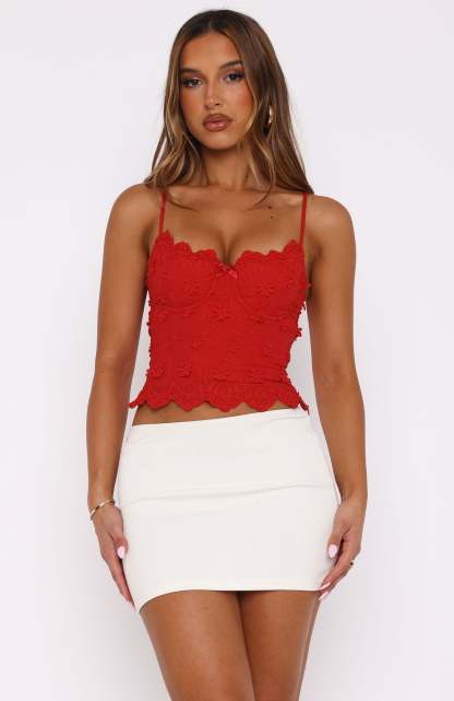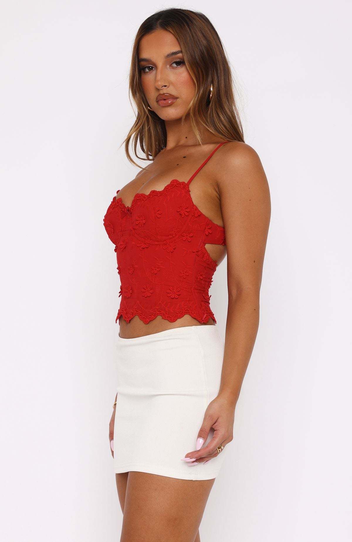 The most adorable bustier has landed! The Everything To Me Bustier Red features thin adjustable straps, bust underwire, cropped length, backless with hook and eye closure, lace trim detailing, lined and stunning 3D knitted floral design. Style with low rise jeans and sandals for a look we adore!