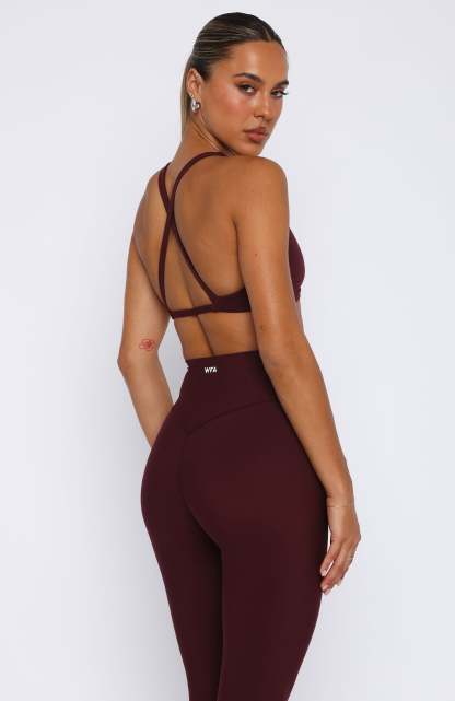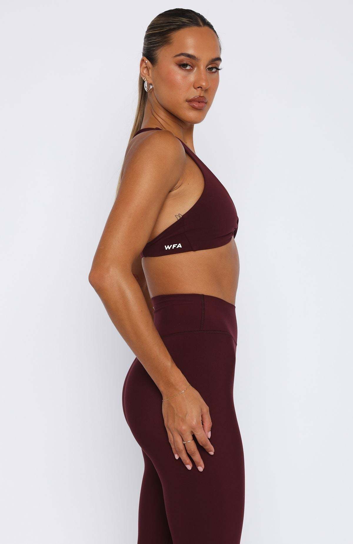Elevate your gym-drobe with the High Definition Sports Bra in Merlot. Features a plunge neckline, thick stretch straps, fitted design, criss-cross back design, lined, removable padding and custom patch detail. Pair with the matching Keep Up High Waisted Shorts 4" Merlot or Go Getter High Waisted Leggings Merlot!