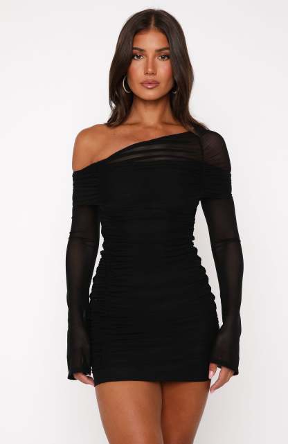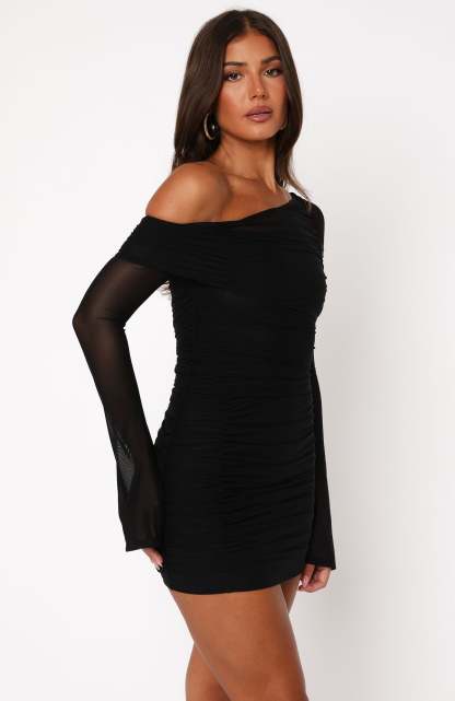 Perfect for those PM days! The I Feel Love Long Sleeve Mini Dress Black features a one shoulder design, unlined at neckline, ruched fabric design, mesh, lined, long sleeve design, mini length and high stretch for an easy slip on design. Keep the vibe going and pair with perspex heels and gold accessories!