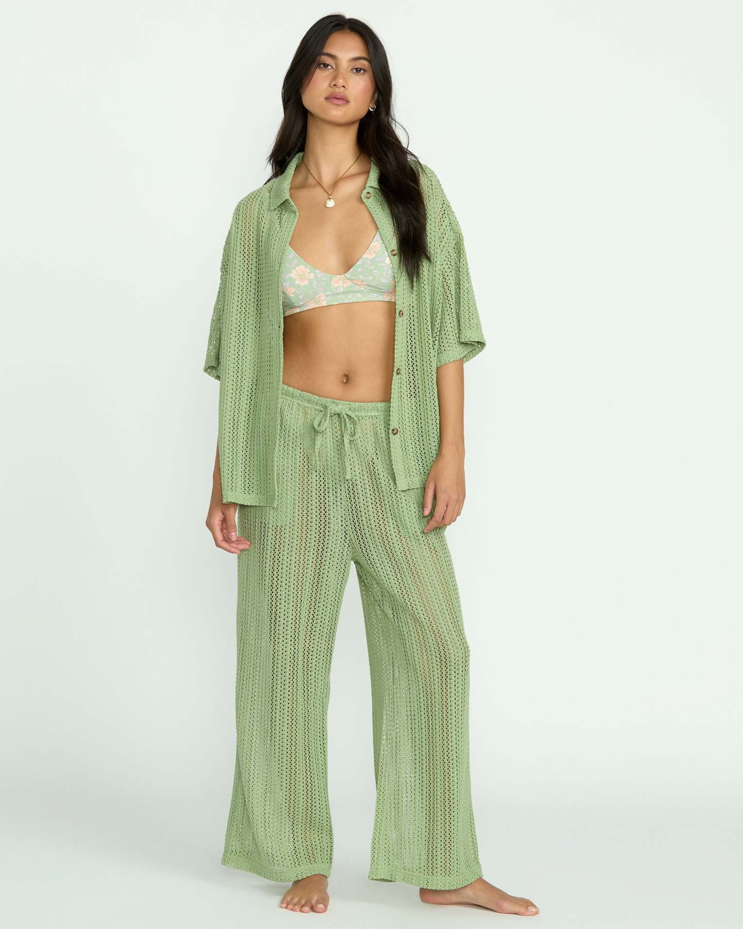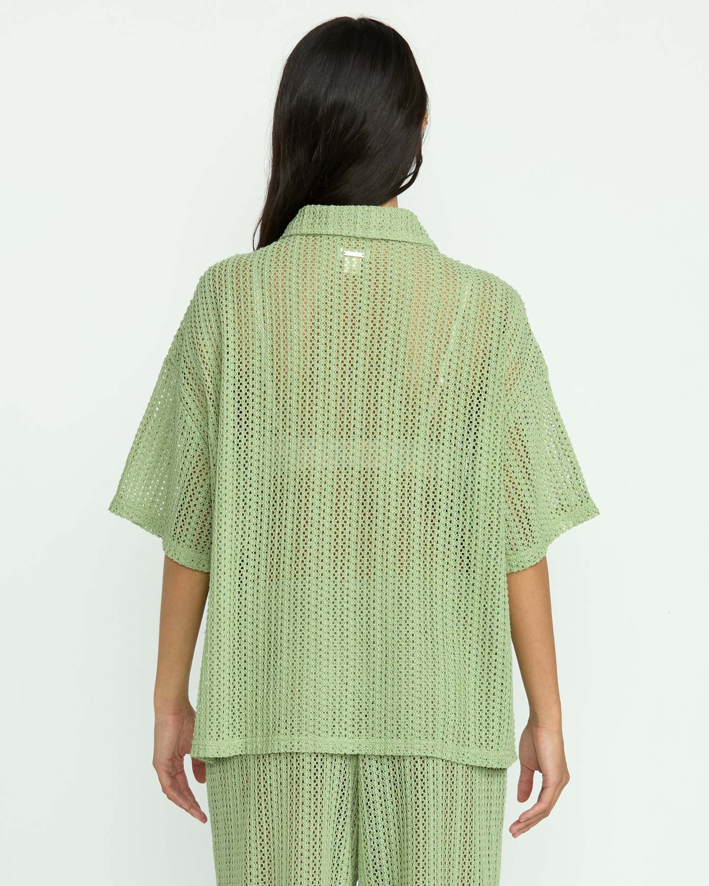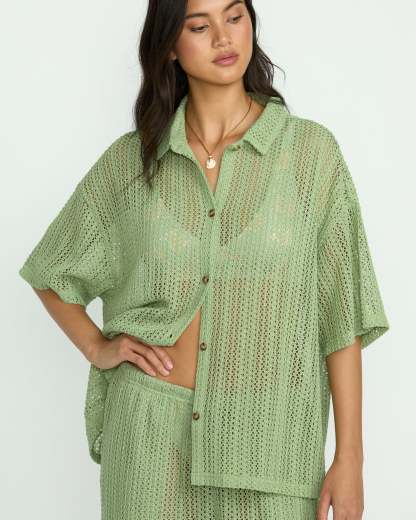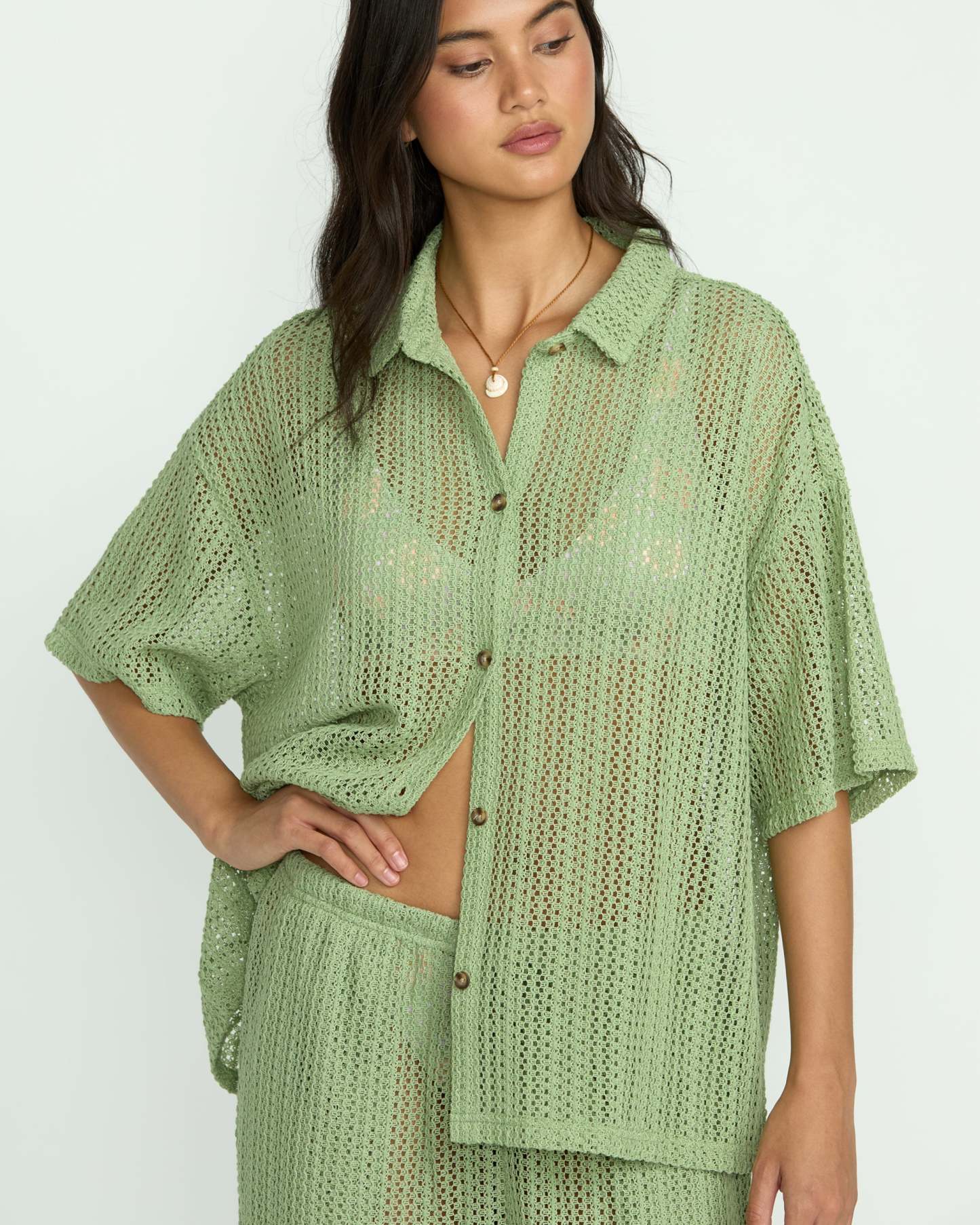 A knit top blending comfort and style. Faux crochet textures pair with a relaxed fit for laidback ease. Button placket and metal plate add borrowed-from-the-boyfriend appeal. Crafted from an ultra-soft polyester/cotton blend. Featured here in the Pistachio colorway.