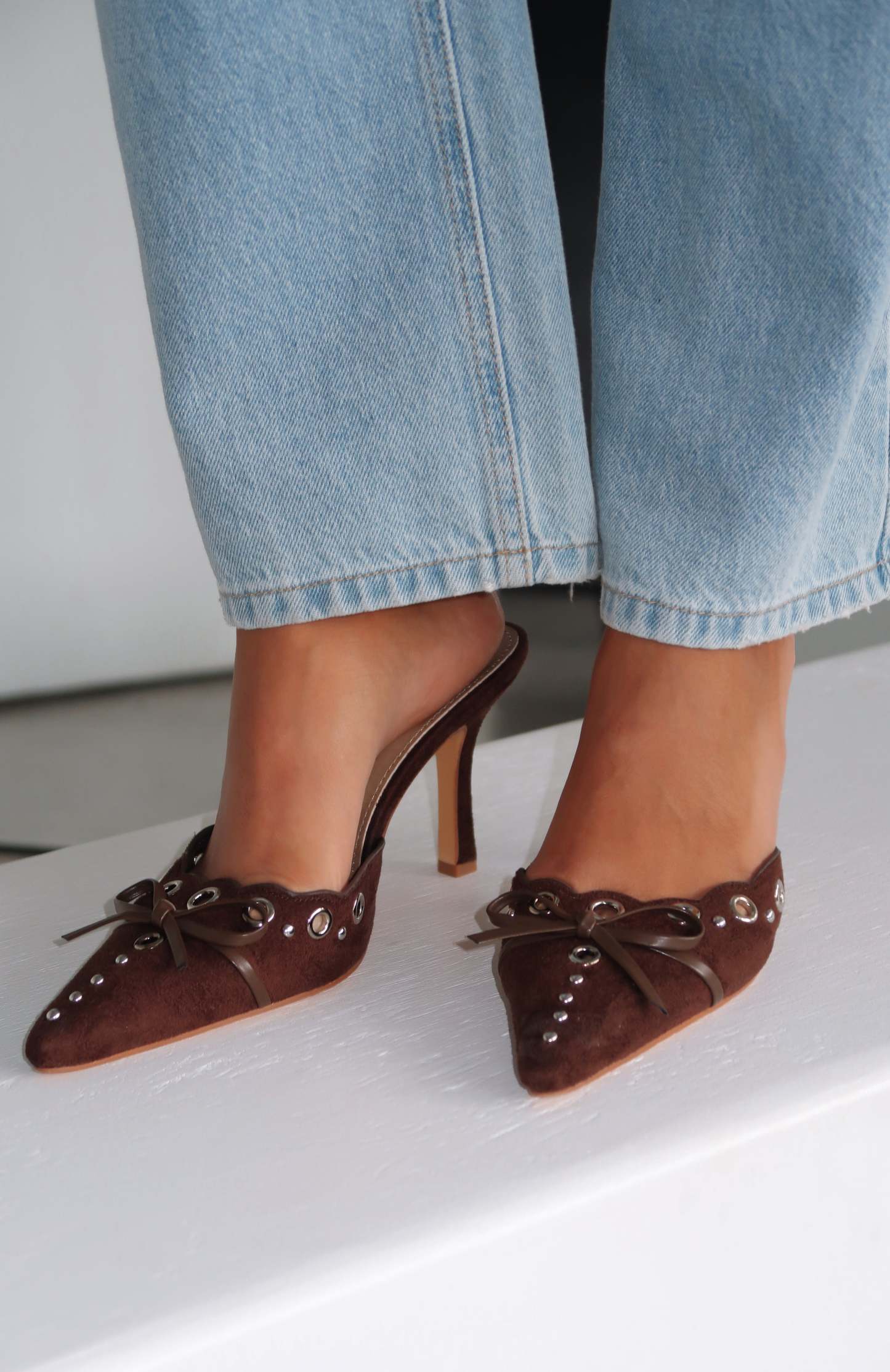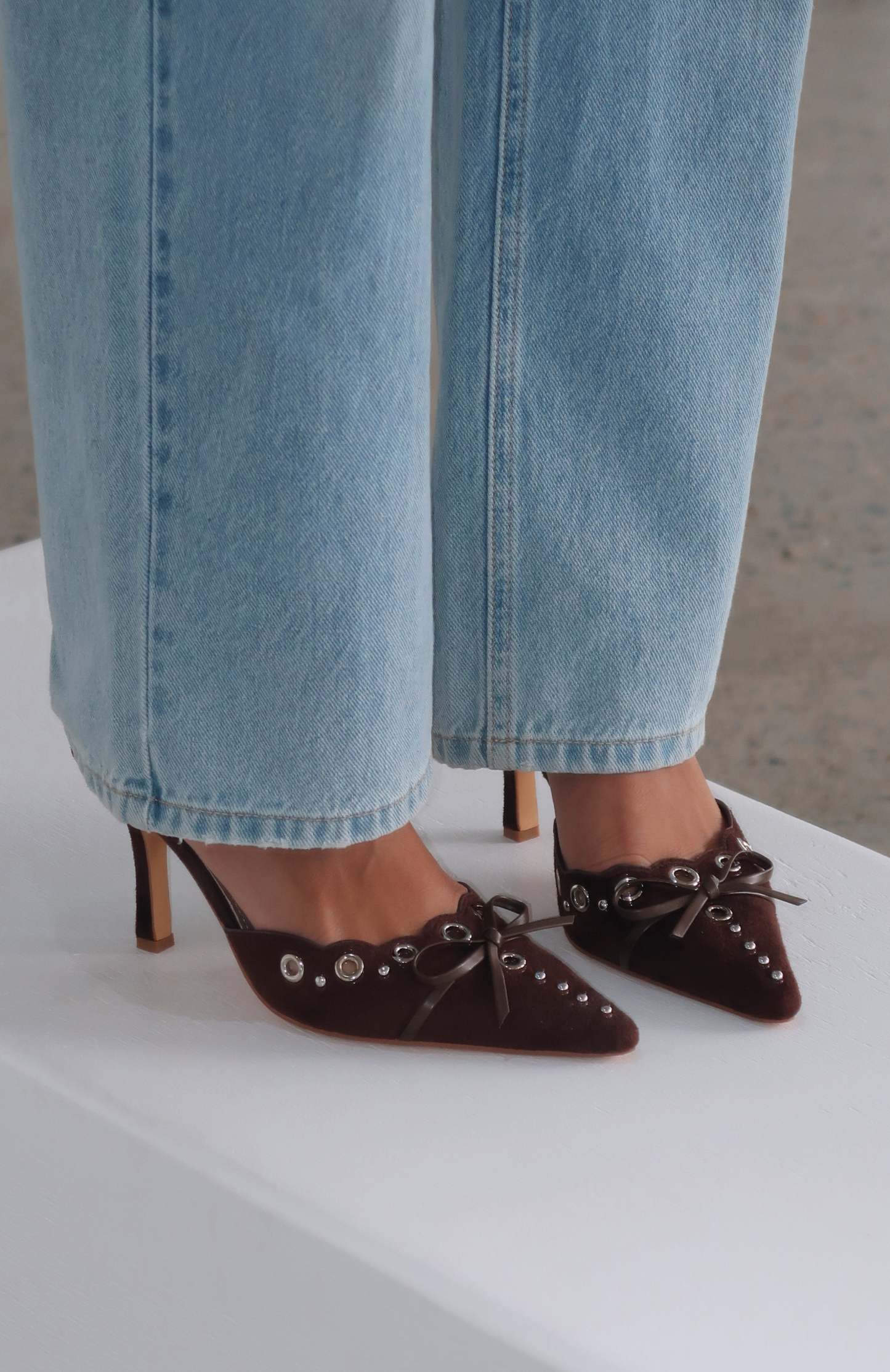 Get the vintage chic look this season with the Leina Heels Chocolate. Featuring eyelet detailing, gold plated studs and a dainty bow on top, this black suede vintage pump will ensure all eyes on you.