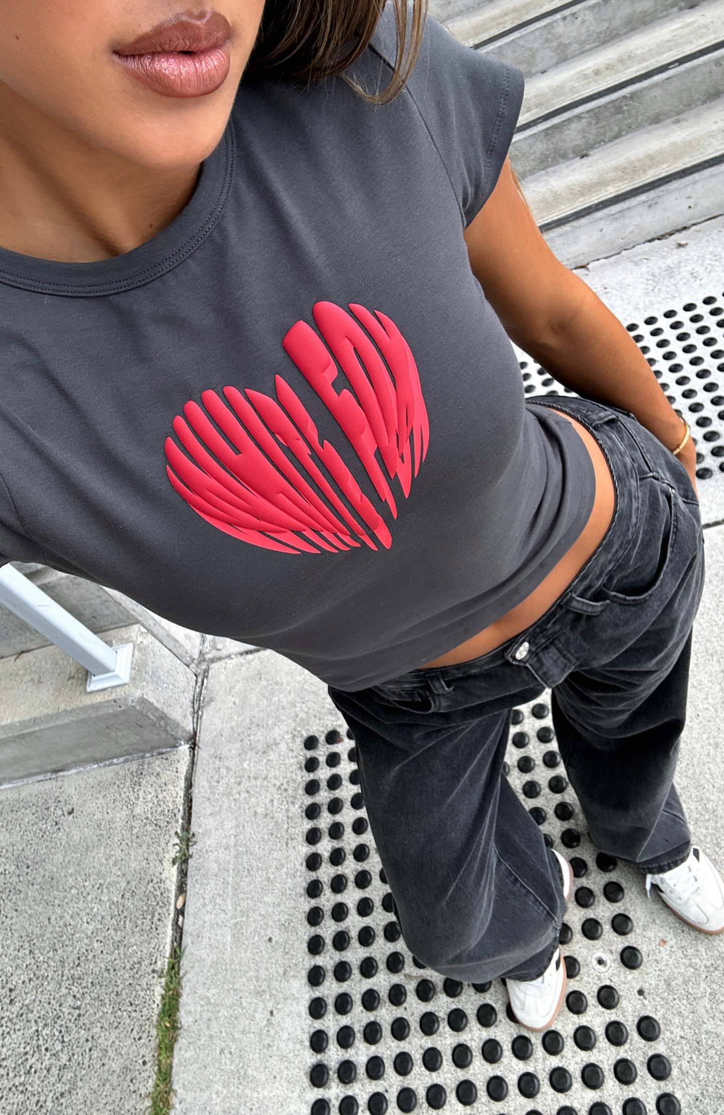 This tee is bursting with cuteness! Featuring a high cut neckline, shorts sleeves, cropped length, figure hugging fit, stretch material for an easy slip on design and centre front puff print logo. Pair with your favourite lounge bottoms and sneakers for an off duty look!
