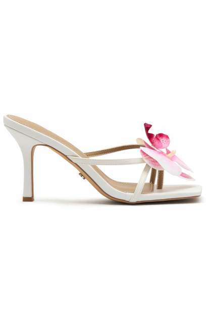 The Megan Mules White/Pink are the dreamiest heels! Featuring an open toe, square design, 2 toe strap design with floral detailing and rounded back- we are in love!