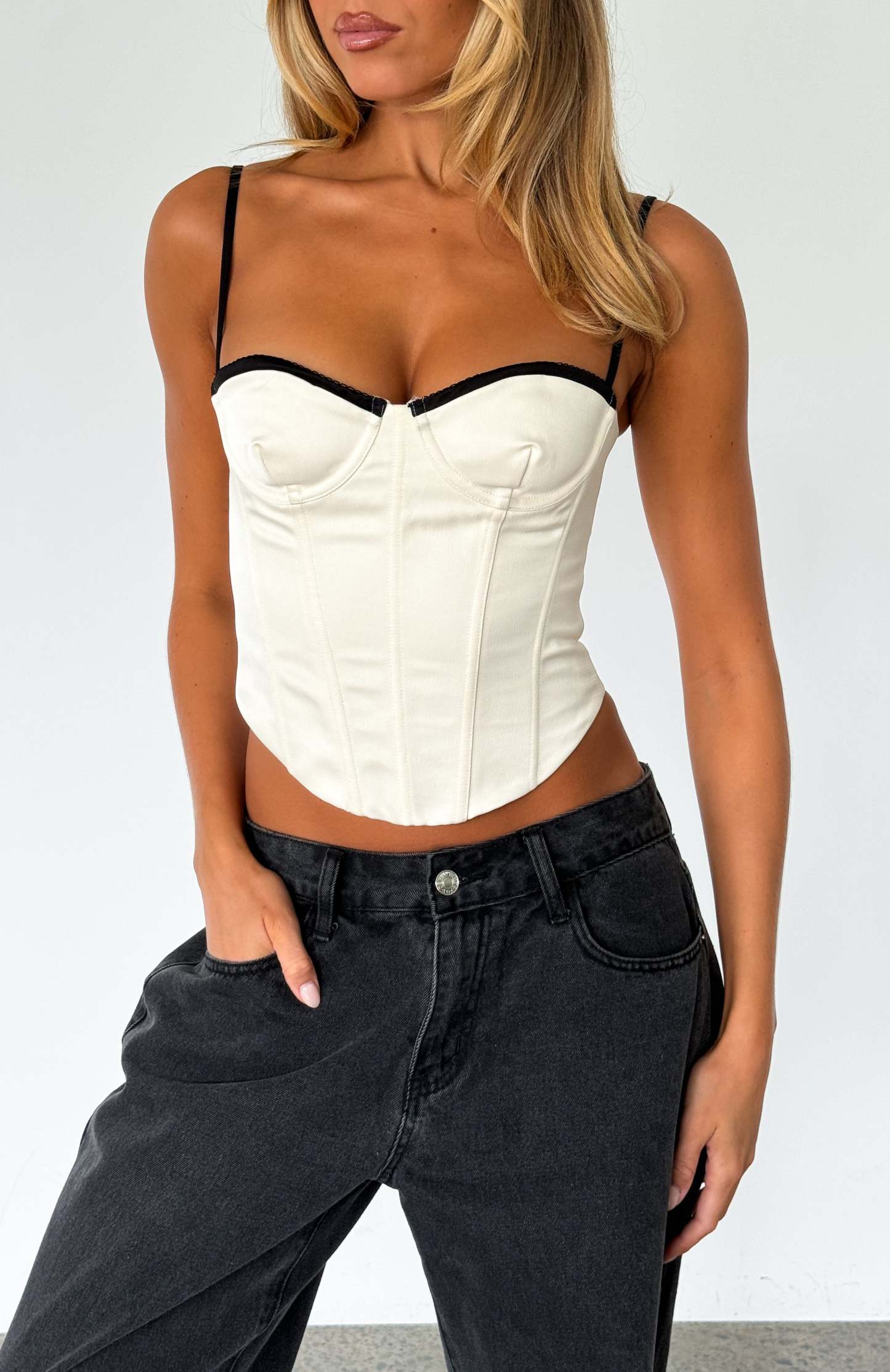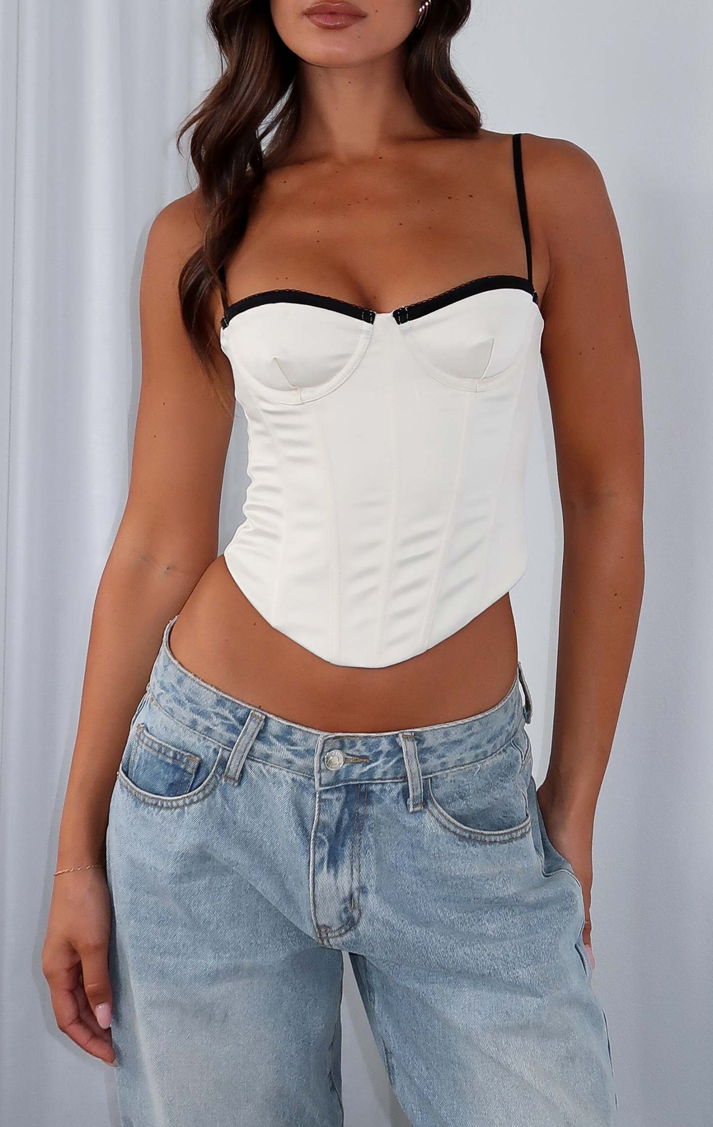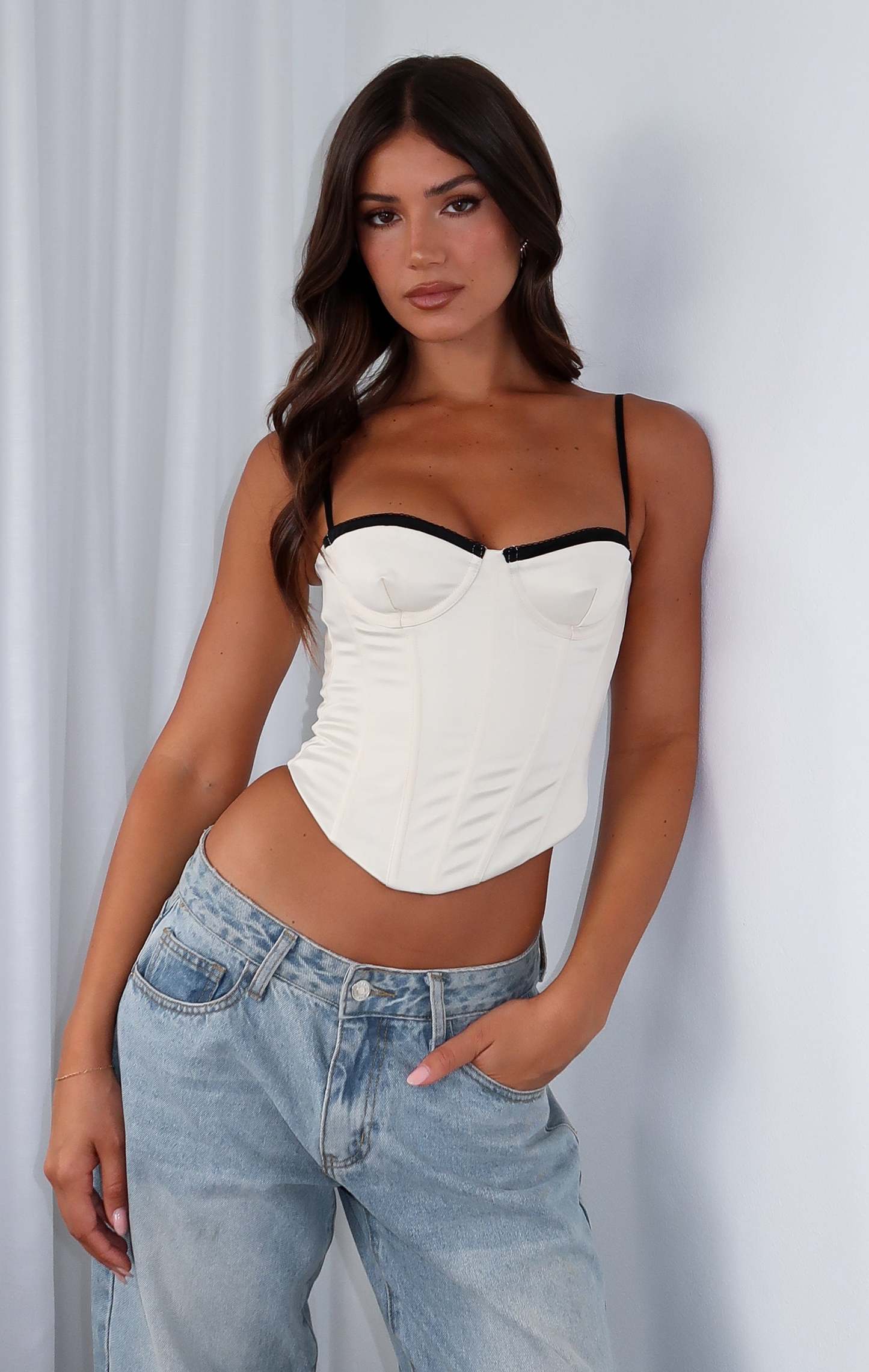 Make hearts race in the My Love For You Bustier Cream. Features thin adjustable straps, bust underwire, boning in bodice, cropped length, back tie up closure and contrast colour-way detailing. We love this paired with jeans and your favourite gold accessories!