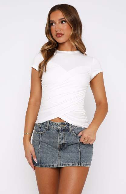 Set the scene in the Never Sorry Tee White. Features a high cut neckline, short sleeves, cropped length with asymmetrical hem and stretch material for an easy slip on design. We love this styled with low waisted jeans and your favourite gold accessories!