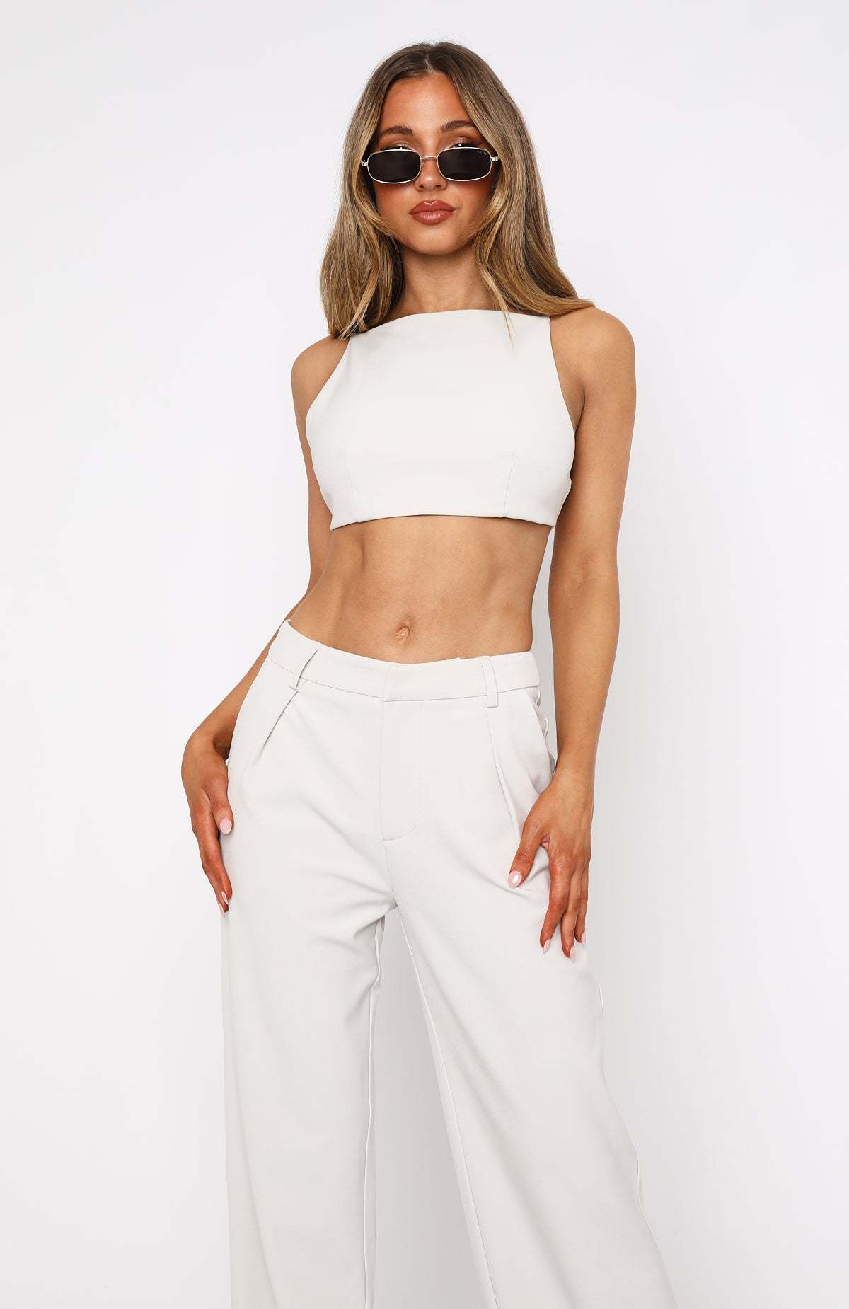 Channel your inner boss babe in the One For The Team Top Bone. Features thin adjustable shoulder straps, high cut neckline, open back with strap detailing, cropped length and lined. Style with the matching One For The Team Pants Bone for a chic, co-ordinated moment!