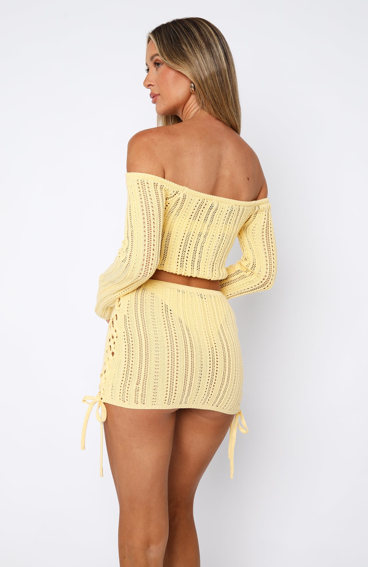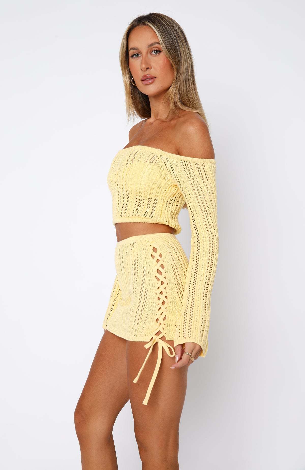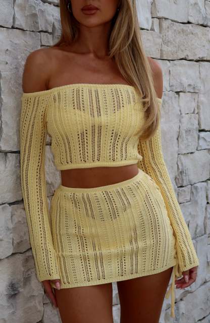 Keep it off the shoulder in the Perfect Timing Crochet Top Lemon. Features an off the shoulder design, crocheted fabric design, unlined, semi-sheer, long sleeves and ultra cropped fit. Team it with the matching Perfect Timing Crochet Mini Skirt Lemon for a look we love!