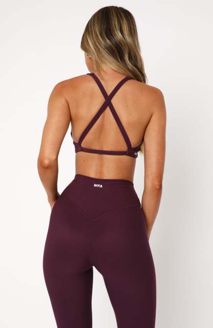 Calling all pilates princesses! This sports bra's got you covered. The Race Me Sports Bra Plum features thick, elasticated shoulder straps, removable padding, backless, plunge neckline, front ruching detailing and printed logo side back. Pair with the matching Go Getter High Waisted Leggings Plum for the ultimate hot girl walk fit!