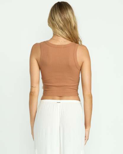 The Rerun knit tank from our Billabong Women's collection. This fitted scoop neck silhouette combines 94% Cotton 6% Elastane Rib fabric with a metallic logo plate for versatile style that moves seamlessly. Featured here in the Rose Brown colorway.
