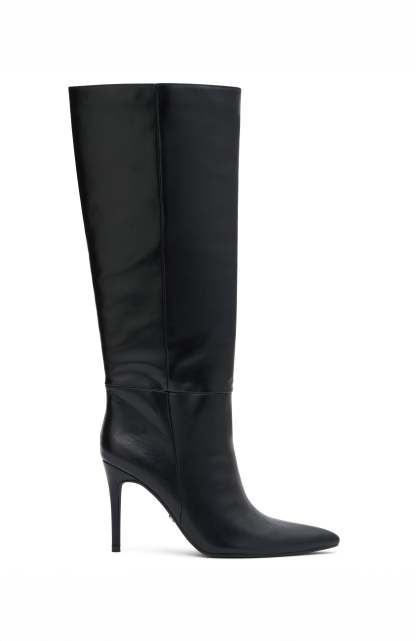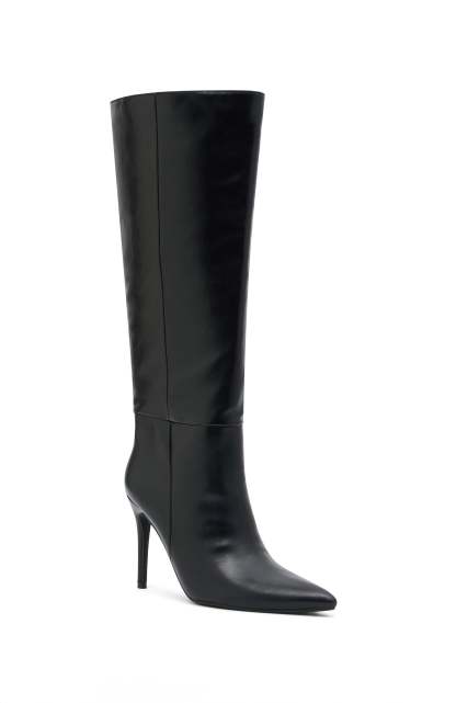 Elevate your look from the ground up with the Run Away With Me Knee High Boots Black. Features a pointed toe, stiletto heel, slip on design and textured fabric design.