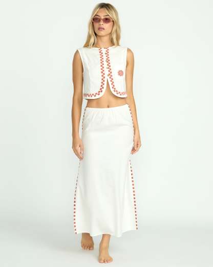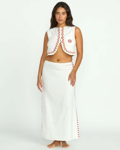 Breezy yet stylish, our Secret Cove Skirt in a cotton-viscose slub boasts a midi skirt length, body skimming fit, and embroidered accents for effortless casual-cool.