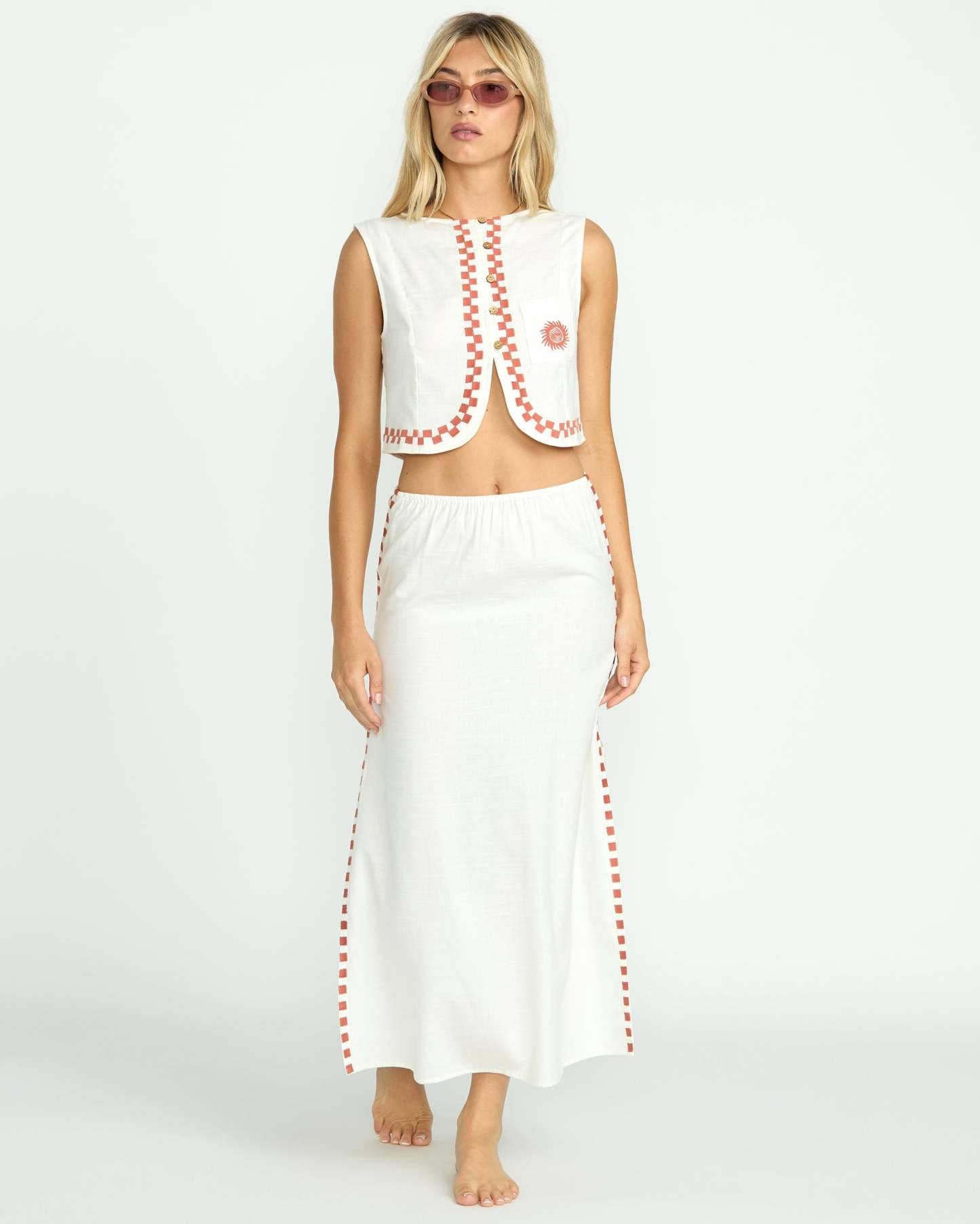 - Elastic waist, embroidery detail at side seams, splits at side seams