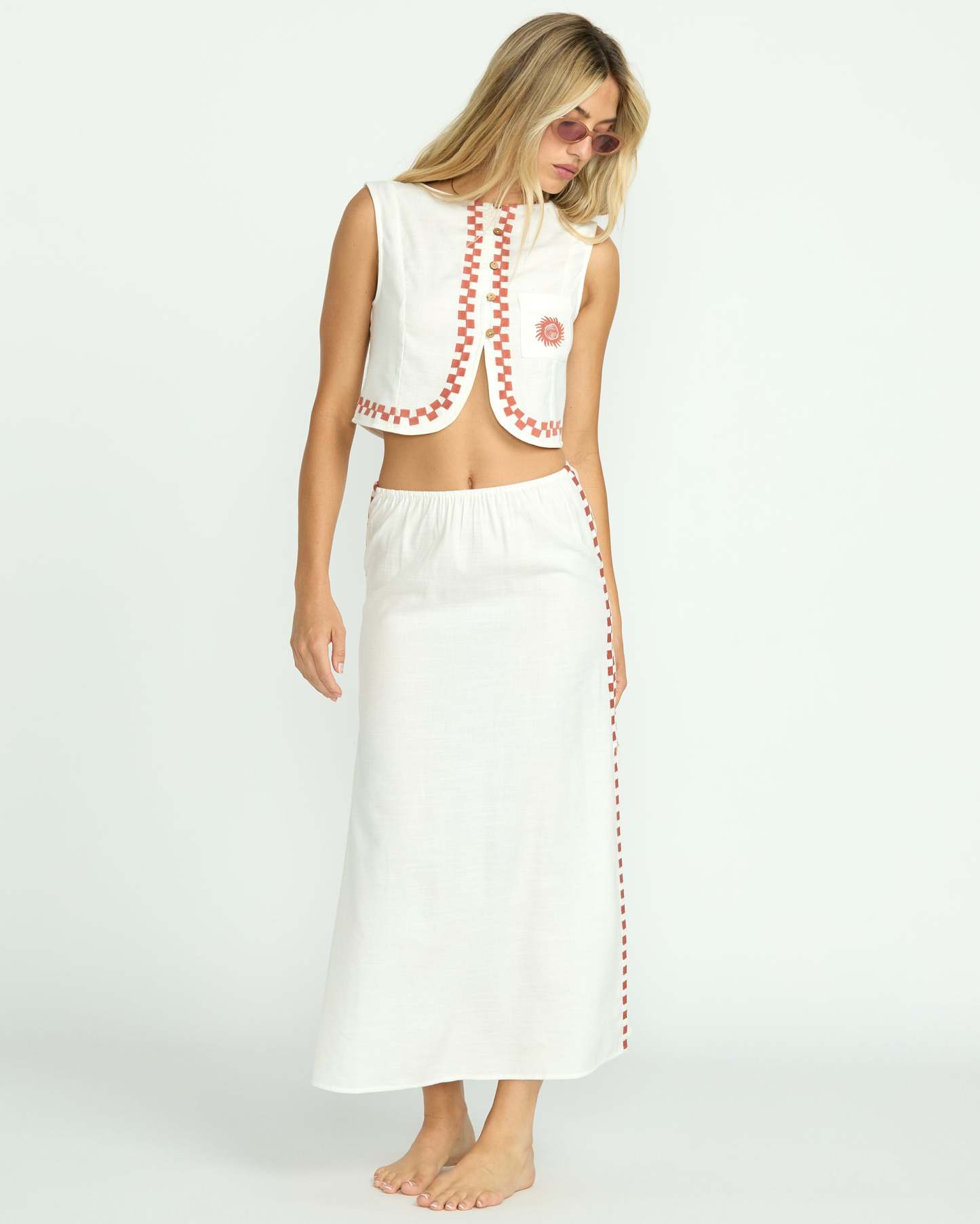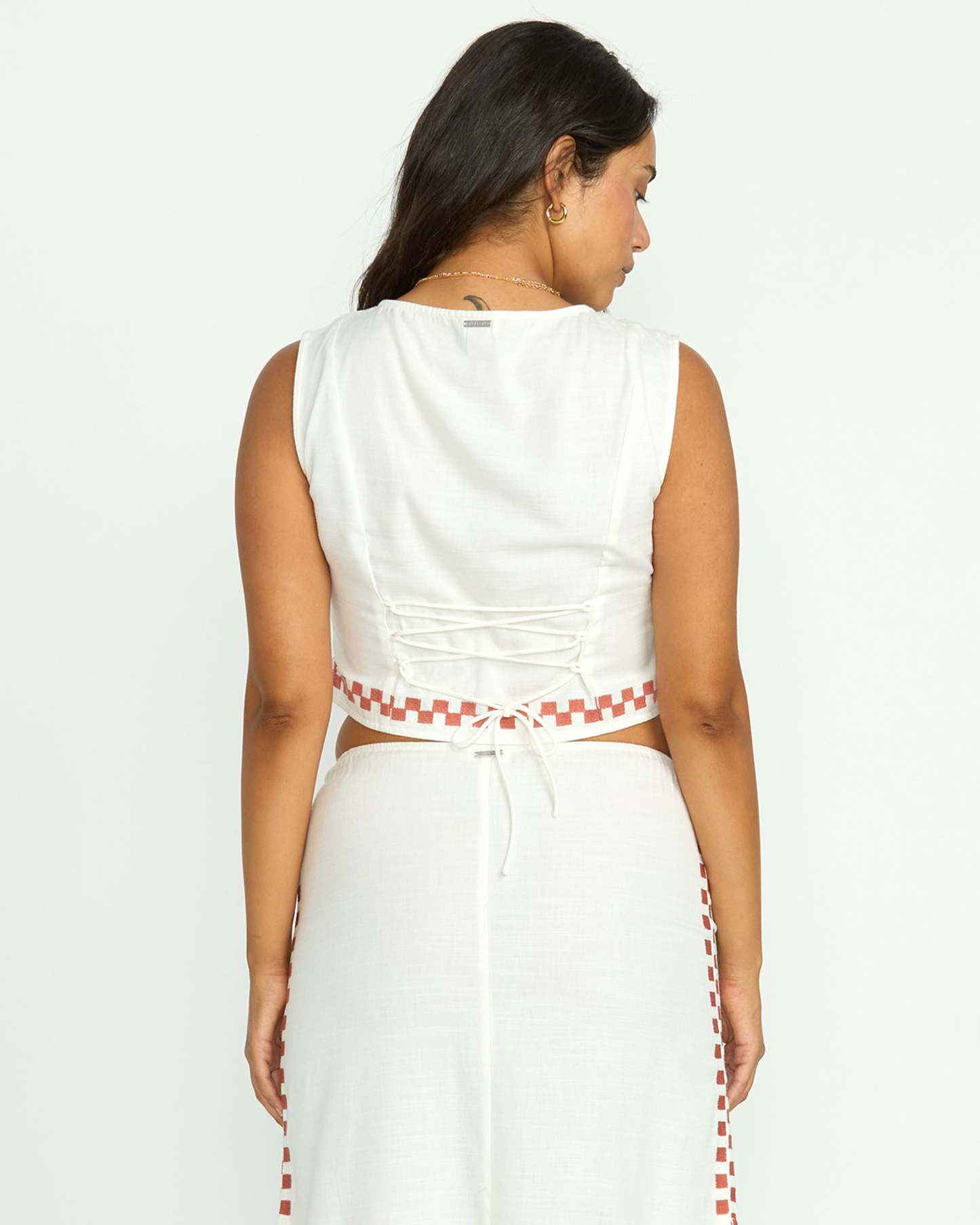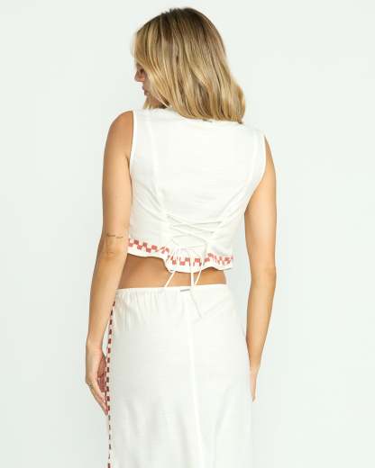 Channel all the sunshine vibes in our Secret Cove, button-front vest top with curved hem. Airy cotton / viscose blend with lace-up back, checkered embroidery and sun details and cropped silhouette.
