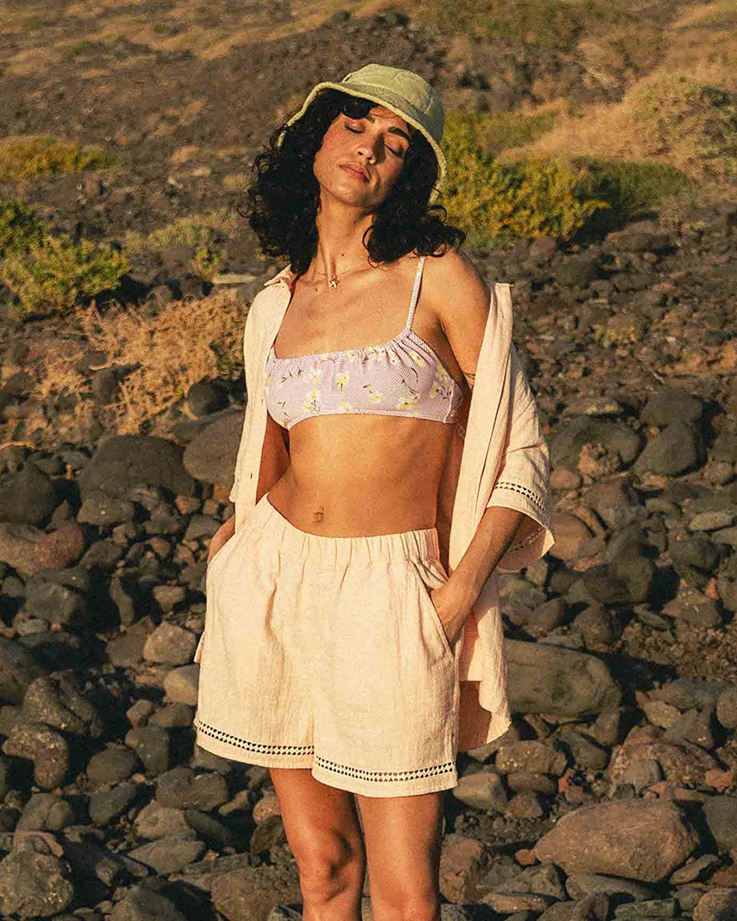 Crafted from breathable cotton gauze with cute lace trim, these relaxed-fit shorts exude carefree summer style. The elastic waist and side pockets keep you comfortable and hands-free, making them perfect for easygoing warm-weather wear. Featured here in the Soft Peach colorway.