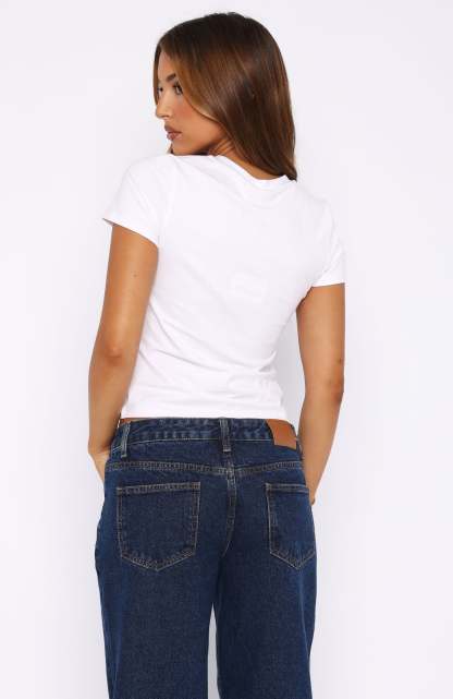 Welcome the new season with the Taking Your Time Relaxed Baby Tee White. Features shorts sleeves, high scoop neckline, stretch fabric and a cute centre front graphic. Pair this perfectly with a denim short and slides for an off duty look!