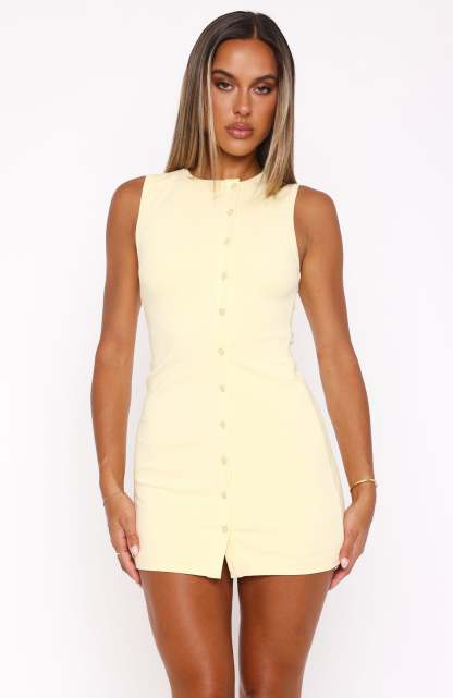 Set the vibes for the weekend in the Things For You Mini Dress Lemon. Featuring an asymmetrical button up closure, lined, stretch material for an easy slip on design and mini length. For a chic weekend look pair with platform slides and your favourite pari of sunglasses!