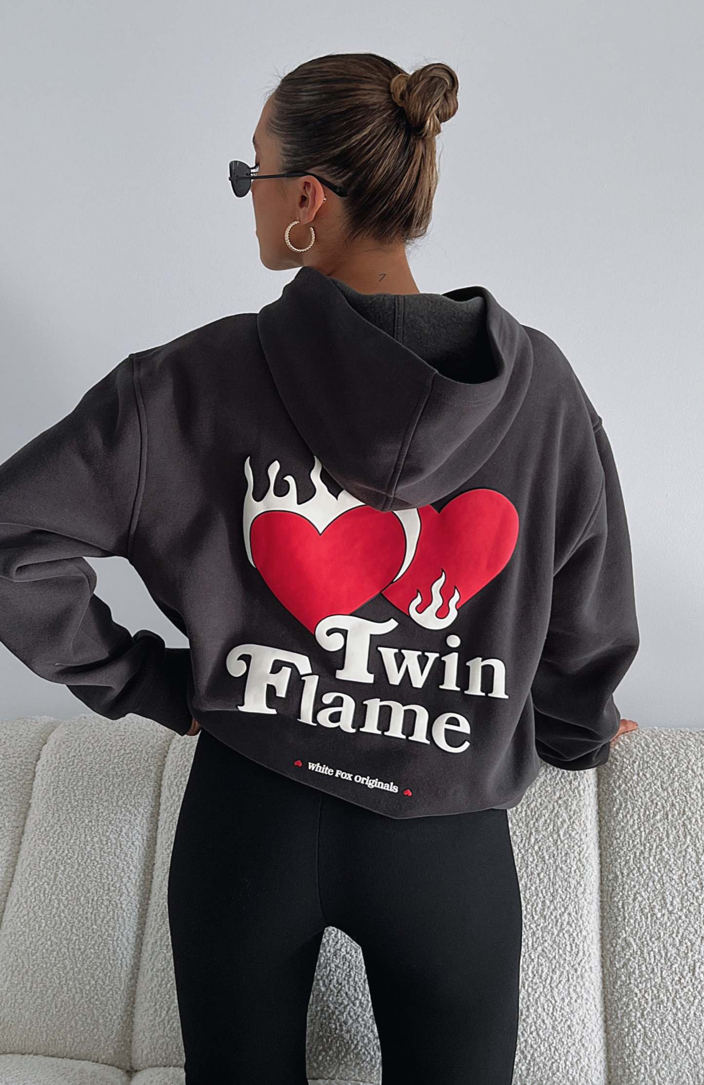 Stay comfy and cosy in the Twin Flame Oversized Hoodie in Charcoal. This hoodie is an oversized fit and features elasticated ribbed cuffs & hem, hood, soft fleeced fabric for extra comfort and a puff print logo centre front and back. We love this paired with bike shorts and sneakers for the perfect off-duty look!