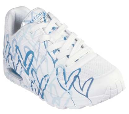 Internationally renowned muralist James Goldcrown brings his iconic #Lovewall heart designs to Skechers in this inspiring collaboration. Show your creative style with the Skechers x JGoldcrown: Skechers Street™ Uno - Spread the Love. This lace-up fashion sneaker features an allover print of the artist's signature heart design that extends to the outsole, synthetic durabuck and perforated trimmed upper with a Skechers Air-Cooled Memory Foam® insole, and a platform wedge with visible Skech-Air® air-cushioned midsole.